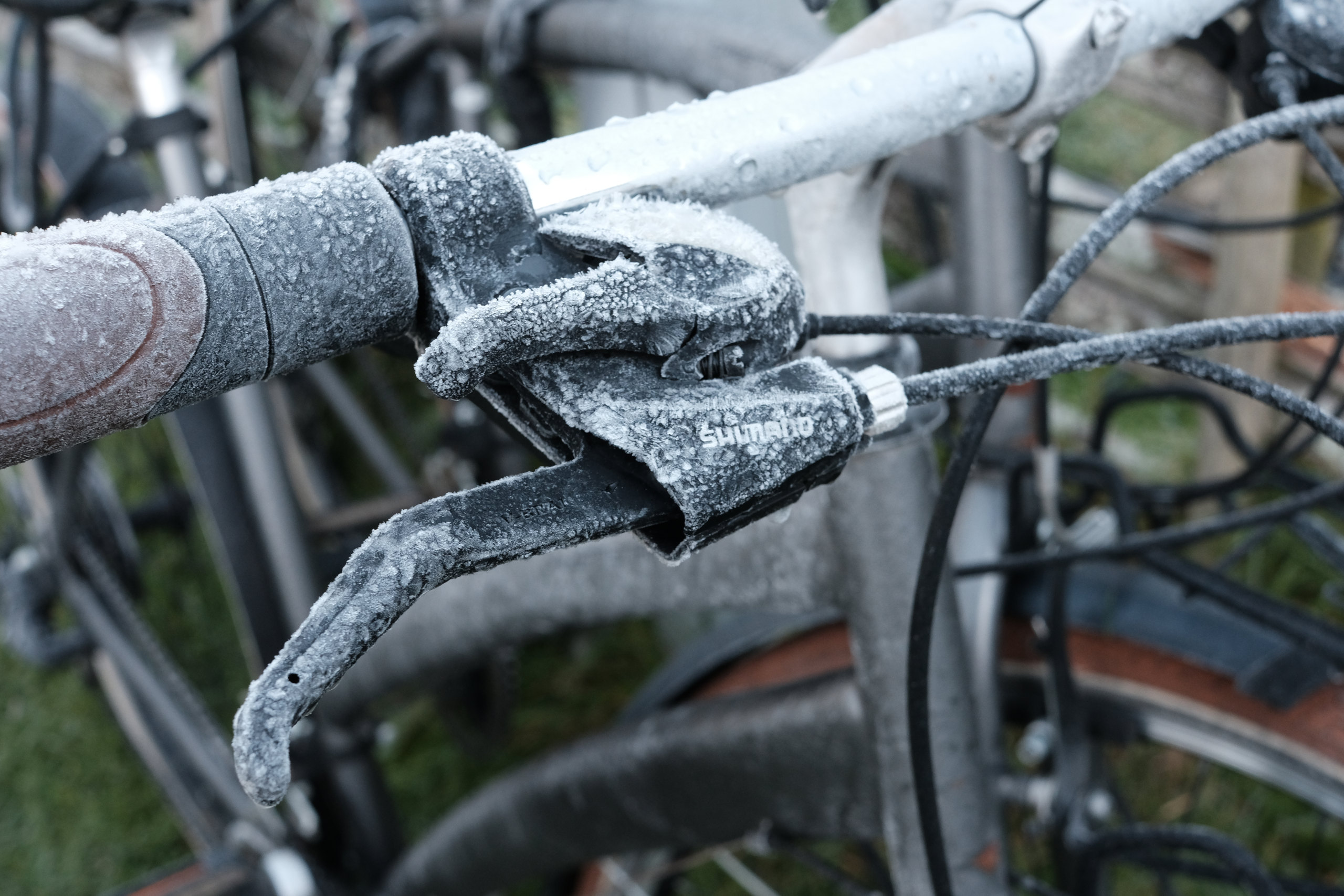 Wie auch immer, als ich das Auto verließ, war ich nicht besonders überrascht: es hatte in der Nacht gefroren. Nachdem ich die Fahrräder auf den Träger gehievt und fixiert hatte, hatte ich ordentlich kalte Hände. Das Aufwickeln des Stromkabels und das Abnehmen der Frontscheiben-Matte dagegen waren weniger schmerzhaft; schließlich muss man hier nicht das blanke Metall anfassen. Kurz nach den ersten Außenarbeiten stieg die Sonne über die Bäume und Hügel und prompt wurde es warm. Ein schöner Tag kündigte sich an.